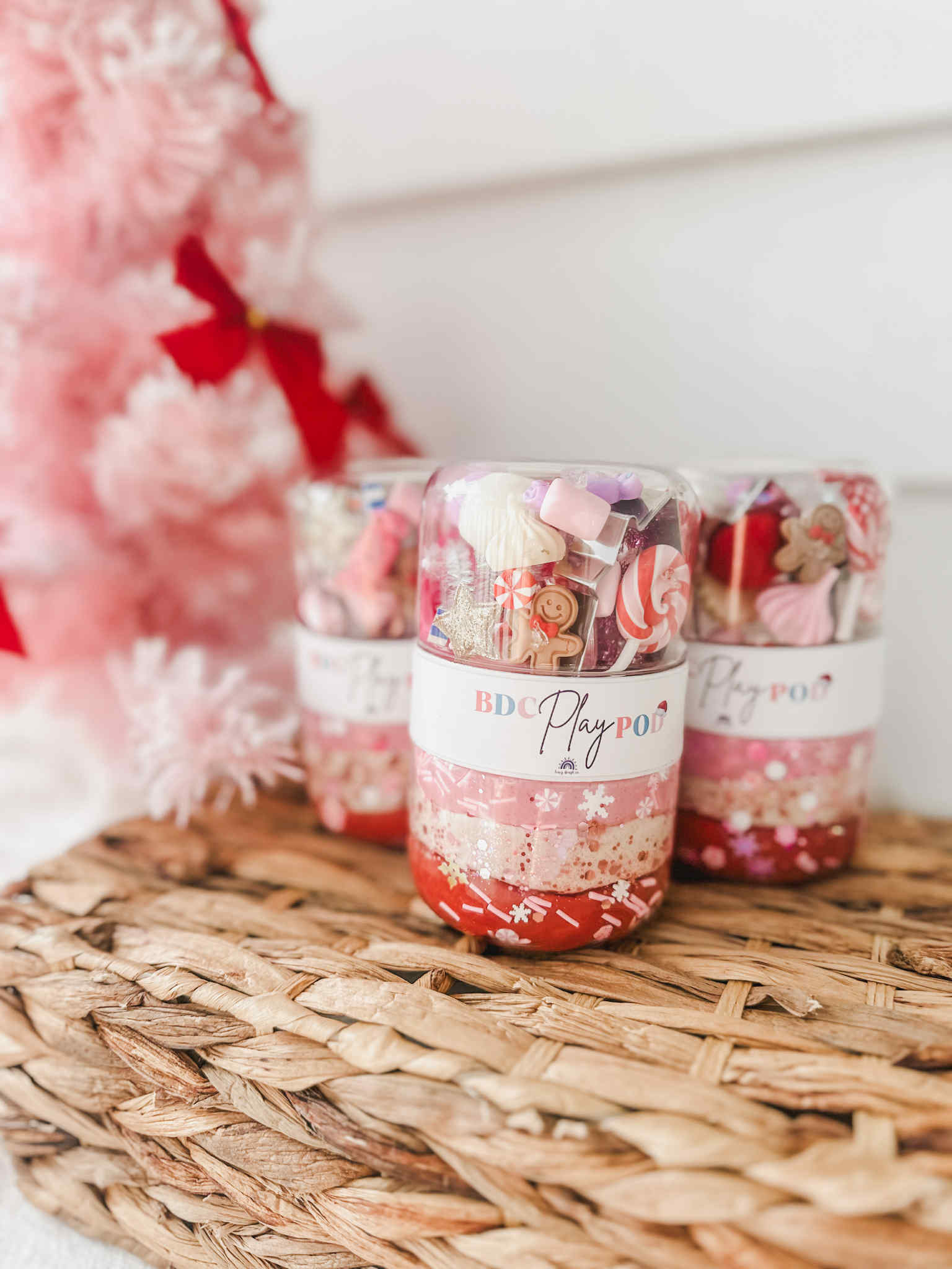 Inside each pod you’ll find 240g of our soft, sparkly play dough, lovingly layered in festive red, snowy white, and candy-pink. Lightly scented with a warm cookie butter fragrance, it smells just like freshly baked Christmas cookies!