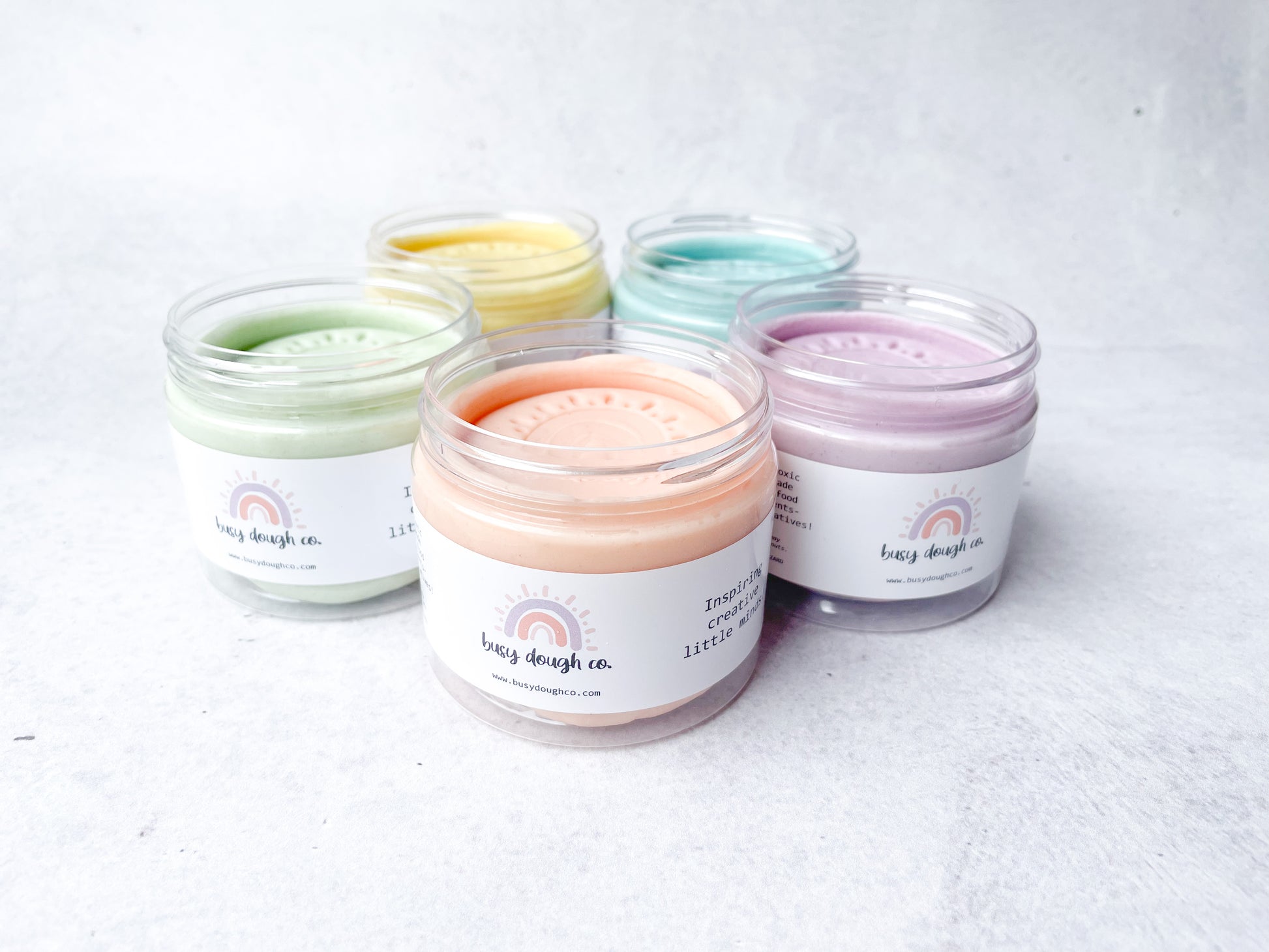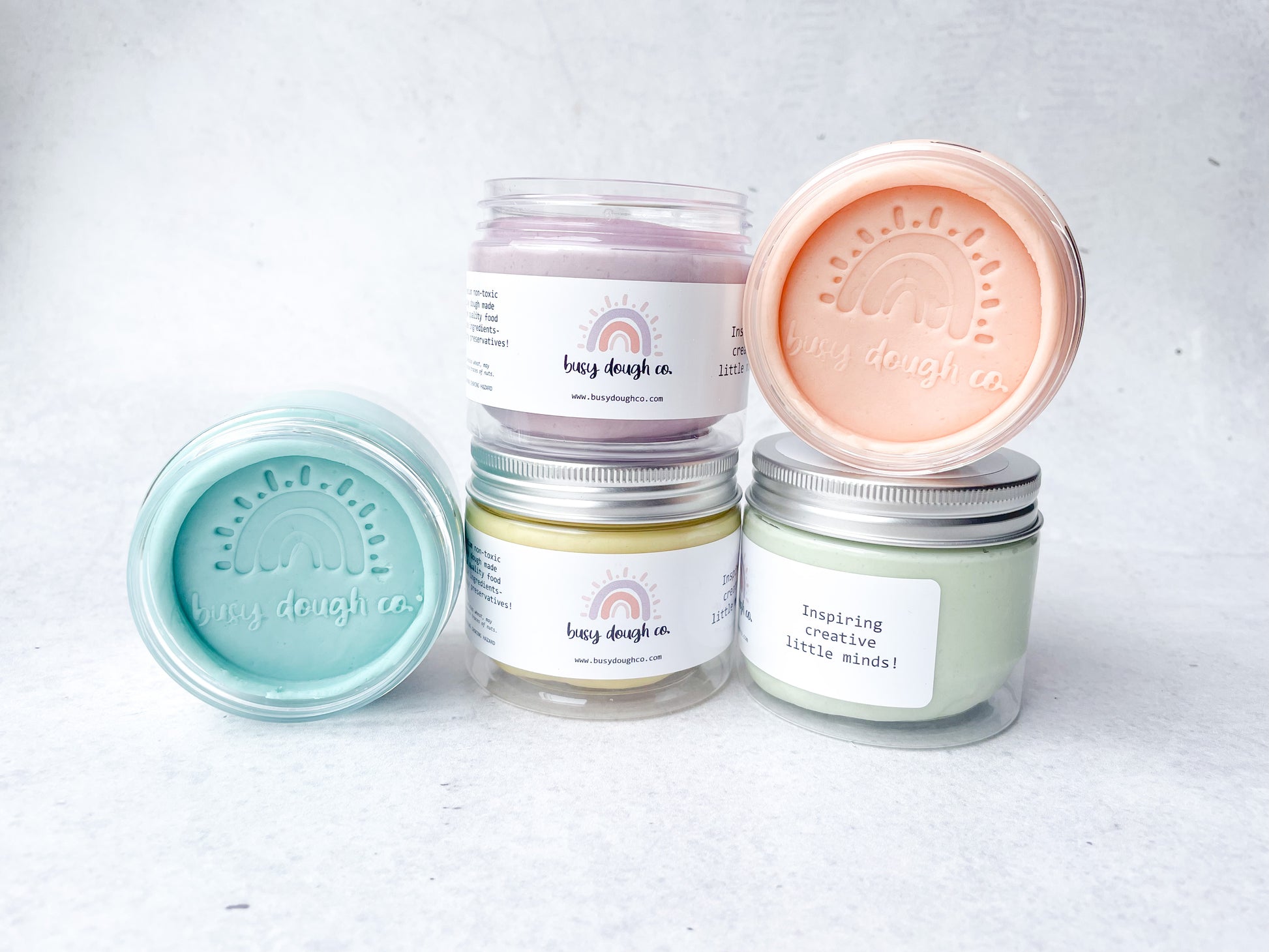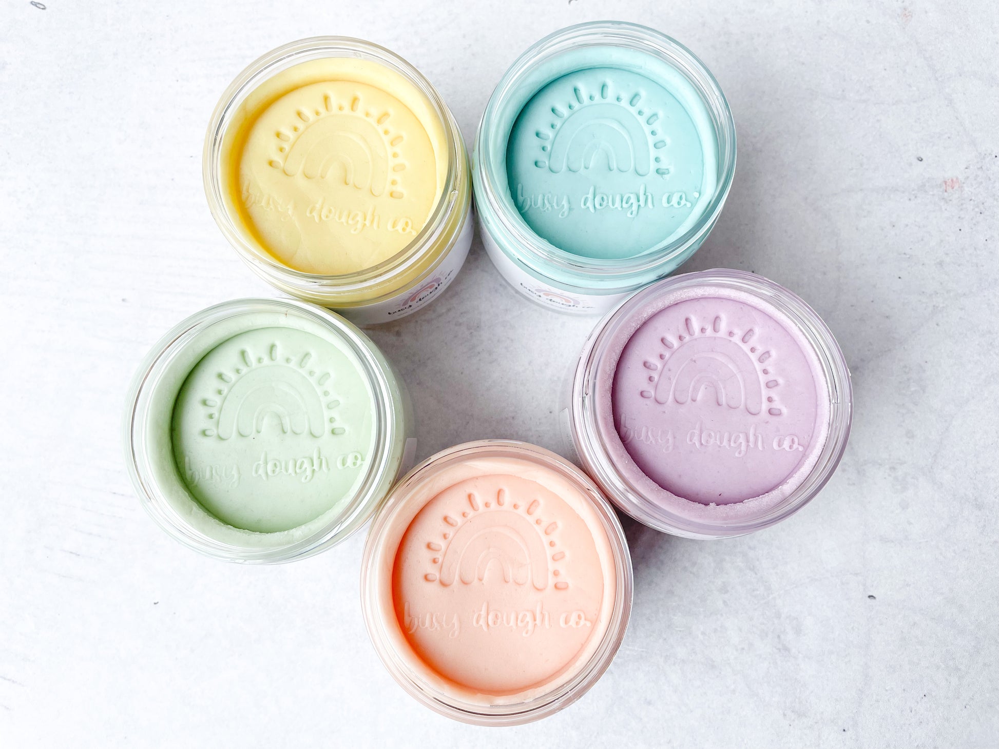 These beautiful soft pastel colours are exclusive to our individual play dough jar range.